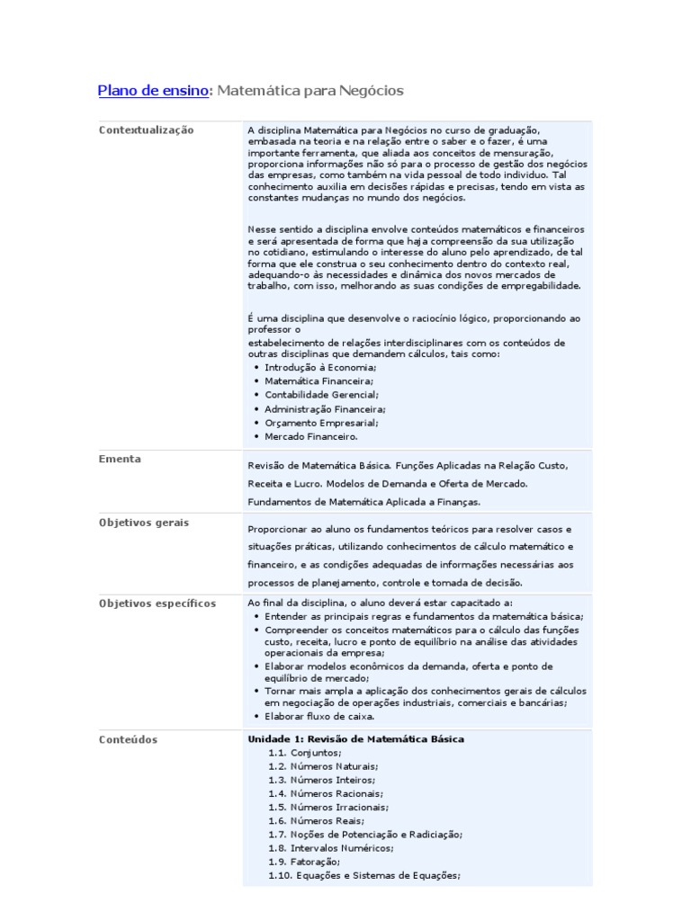 A disciplina Matemtica para Negcios no curso de graduao, embasada na teoria e na relao entre o saber e o fazer, uma importante ferramenta, que aliada aos conceitos de mensurao, proporciona informaes no s para o processo de gesto dos negcios das empresas, como tambm na vida pessoal de todo individuo. Tal conhecimento auxilia em decises rpidas e precisas, tendo em vista as constantes mudanas no mundo dos negcios. Nesse sentido a disciplina envolve contedos matemticos e financeiros e ser apresentada de forma que haja compreenso da sua utilizao no cotidiano, estimulando o interesse do aluno pelo aprendizado, de tal forma que ele construa o seu conhecimento dentro do contexto real, adequando-o s necessidades e dinmica dos novos mercados de trabalho, com isso, melhorando as suas condies de empregabilidade. uma disciplina que desenvolve o raciocnio lgico, proporcionando ao professor o estabelecimento de relaes interdisciplinares com os contedos de outras disciplinas que demandem clculos, tais como: Introduo Economia; Matemtica Financeira; Contabilidade Gerencial; Administrao Financeira; Oramento Empresarial; Mercado Financeiro.
