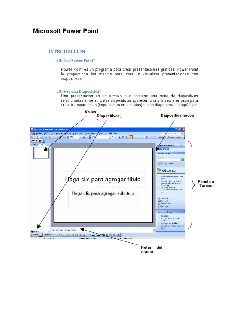 Qu es Power Point? Power Point es un programa para crear presentaciones grficas. Power Point le proporciona los medios para crear y visualizar presentaciones con diapositivas. Qu es una Diapositiva? Una presentacin es un archivo que contiene una serie de diapositivas relacionadas entre s. Estas diapositivas aparecen una a la vez y se usan para crear transparencias (impresiones en acetatos) o bien diapositivas fotogrficas. Vistas: Diapositivas, Esquema Diapositiva nueva