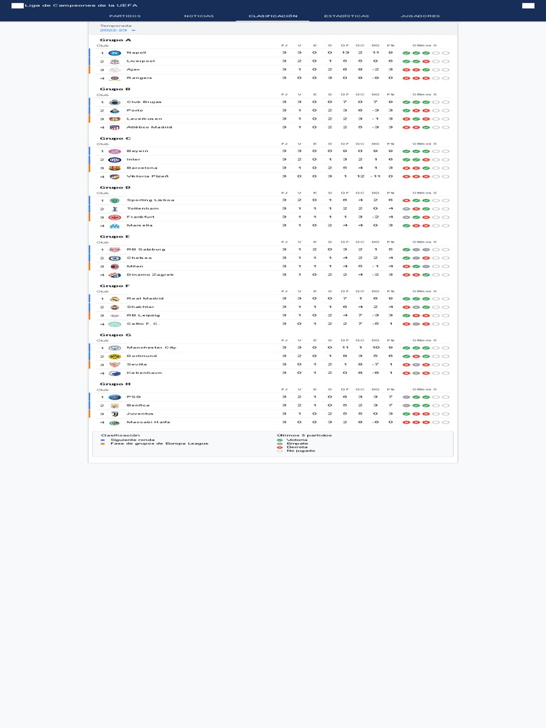 Todos los partidos, grupos, clasificaciones y resultados de la Liga de Campeones.