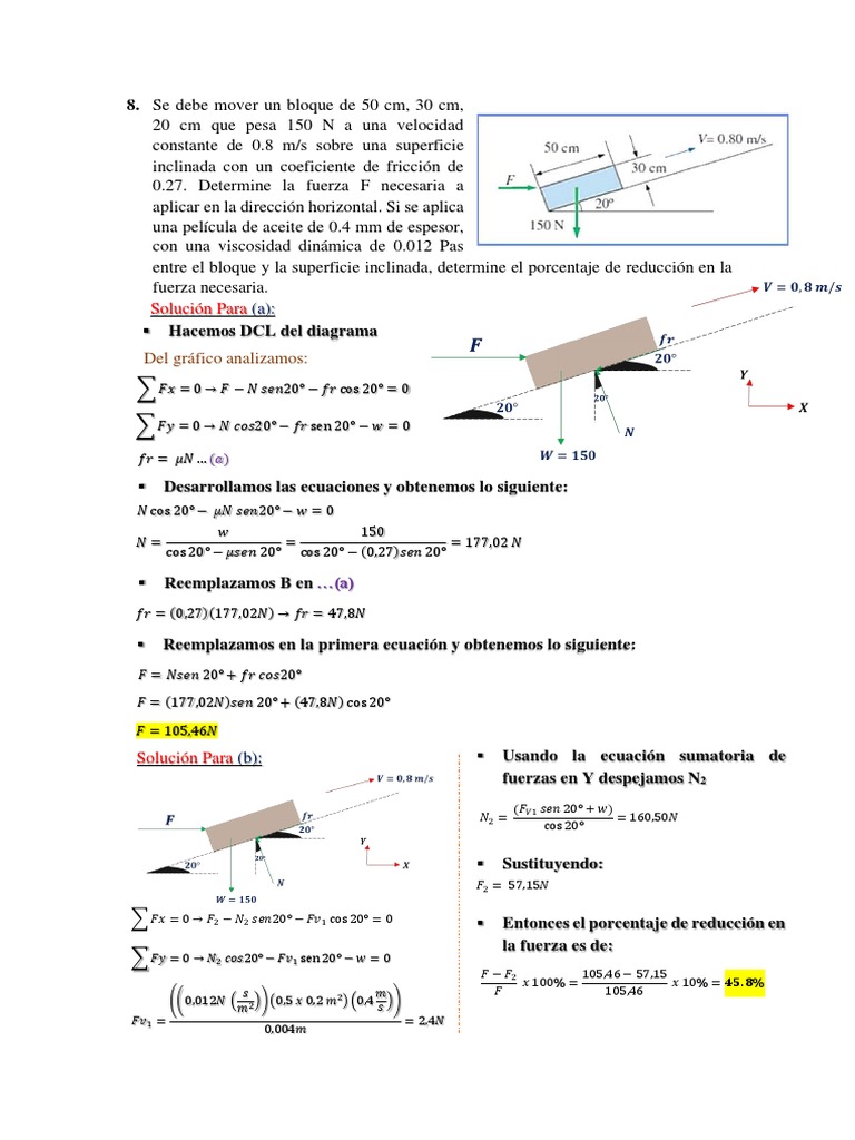 entre el bloque y la superficie inclinada, determine el porcentaje de reducción en la