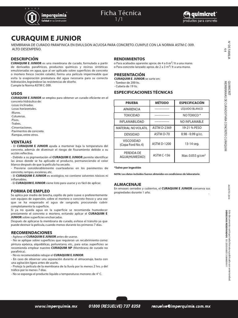 CURAQUIM E JUNIOR es una membrana de curado, formulada a partir o Para acabados aparente: aprox. de 4 a 6 m2/ lt a una mano.