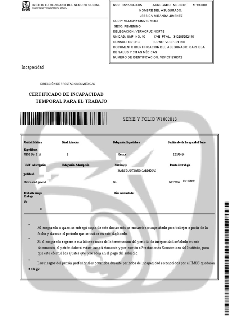 Unidad Médica Nivel Atención Delegación Expedidora Certificado de Incapacidad Serie