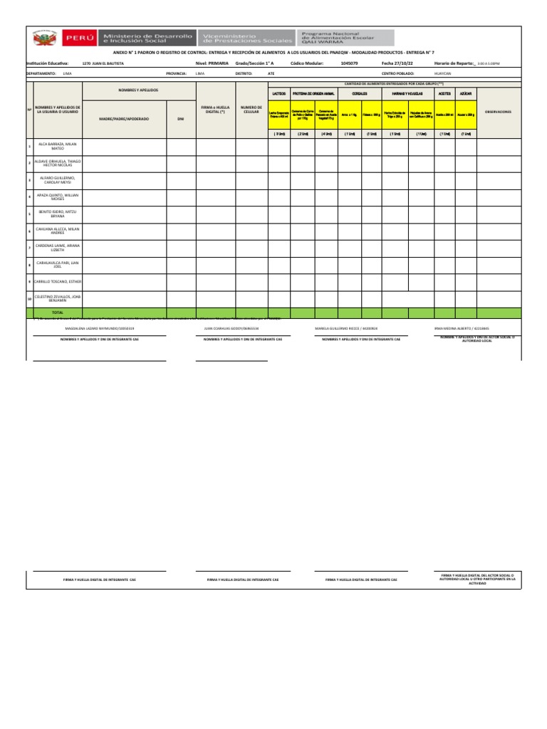 NOMBRES Y APELLIDOS DE FIRMA o HUELLA NUMERO DE Conserva de Carne Conserva de Hojuelas de Avena