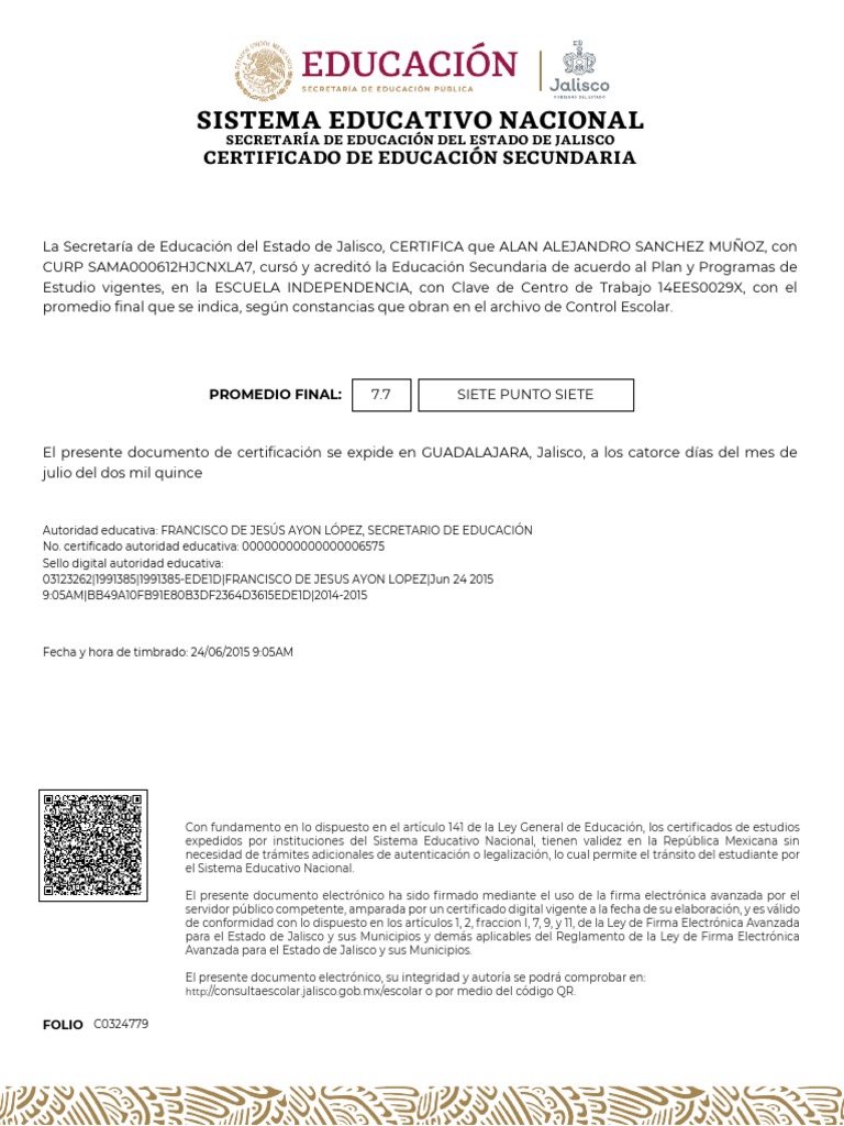 La Secretaría de Educación del Estado de Jalisco, CERTIFICA que ALAN ALEJANDRO SANCHEZ MUÑOZ, con