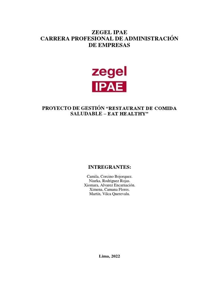El presente proyecto de gestión titulado “Restaurant de comida saludable - Eat Healthy “,