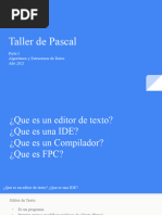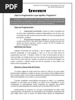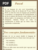 1. En qu consiste el abecedario de Pascal? Cules smbolos no forman parte de ste? Qu sucede con los caracteres cuyo cdigo ASCII es mayor que 127? 2. Son consideradas iguales o no las letras minsculas y maysculas en Pascal? 3. Qu es un identificador? Para qu se usa? Resuma las reglas de construccin de identificadores. 4. Puede escribirse un identificador con una mezcla de letras maysculas y minsculas? 5. Qu es una palabra reservada? Puede usarse una palabra reservada como nombre de variable? Y como nombre de programa? 6. Cmo se escriben nmeros en Pascal? Cree usted que se pueden escribir entre comillas? Cules caracteres se pueden utilizar en la escritura de nmeros? 7. Puede escribirse un nmero entero de varias maneras? Y un nmero real? 8. A qu cree usted que se debe la diferenciacin entre nmeros enteros y nmeros reales en Pascal? 9. Dado que un nmero real puede ser escrito de varias formas debido a la presencia del exponente E cmo cree usted que puede llamarse este exponente?