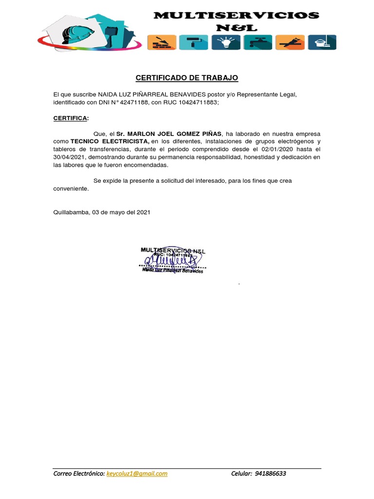 como TECNICO ELECTRICISTA, en los diferentes, instalaciones de grupos electrógenos y
