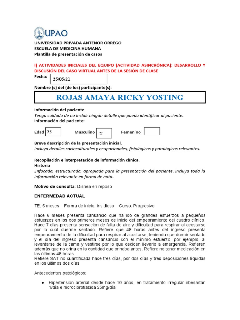 por lo cual duerme sentado. Refiere que 48 horas antes del ingreso presenta