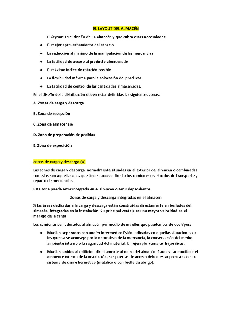 El layout: Es el diseño de un almacén y que cubra estas necesidades: