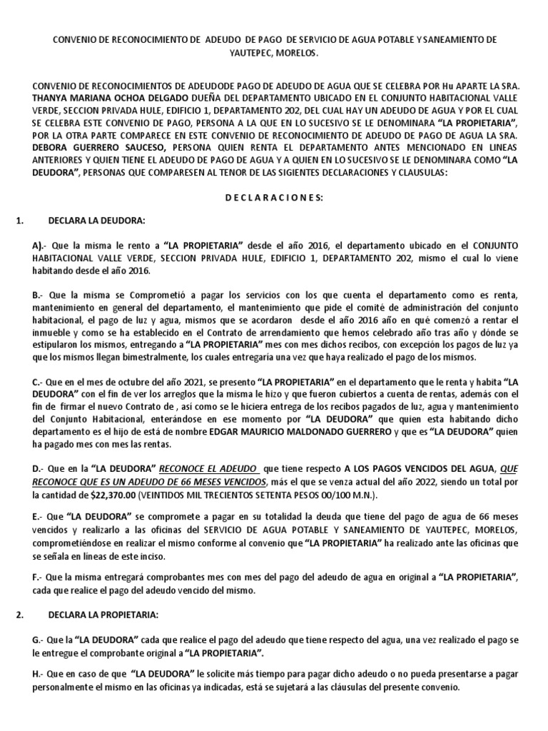 CONVENIO DE RECONOCIMIENTOS DE ADEUDODE PAGO DE ADEUDO DE AGUA QUE SE CELEBRA POR Hu APARTE LA SRA.
