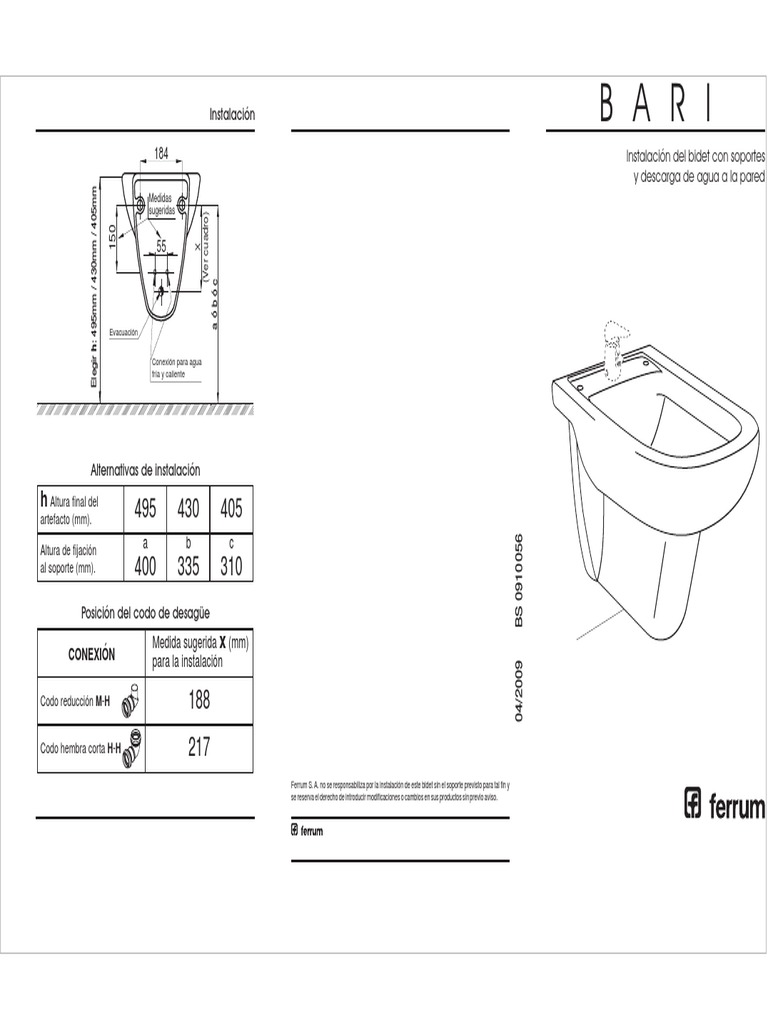 Ferrum S. A. no se responsabiliza por la instalación de este bidet sin el soporte previsto para tal fin y
