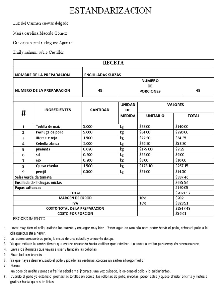 NOMBRE DE LA PREPARACION ENCHILADAS SUIZAS