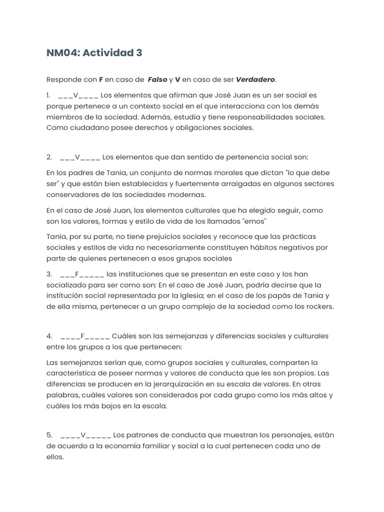 1. ___V____ Los elementos que afirman que José Juan es un ser social es