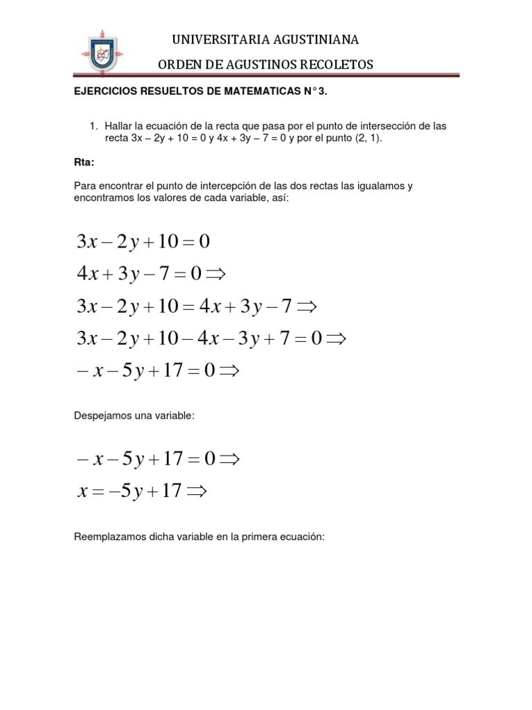 1. Hallar la ecuacin de la recta que pasa por el punto de interseccin de las