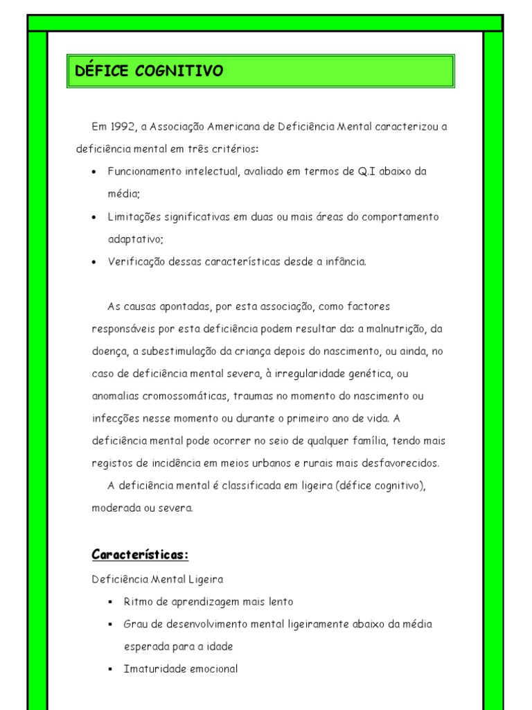 Em 1992, a Associao Americana de Deficincia Mental caracterizou a deficincia mental em trs critrios: Funcionamento intelectual, avaliado em termos de Q.I abaixo da mdia; Limitaes significativas em duas ou mais reas do comportamento adaptativo; Verificao dessas caractersticas desde a infncia.