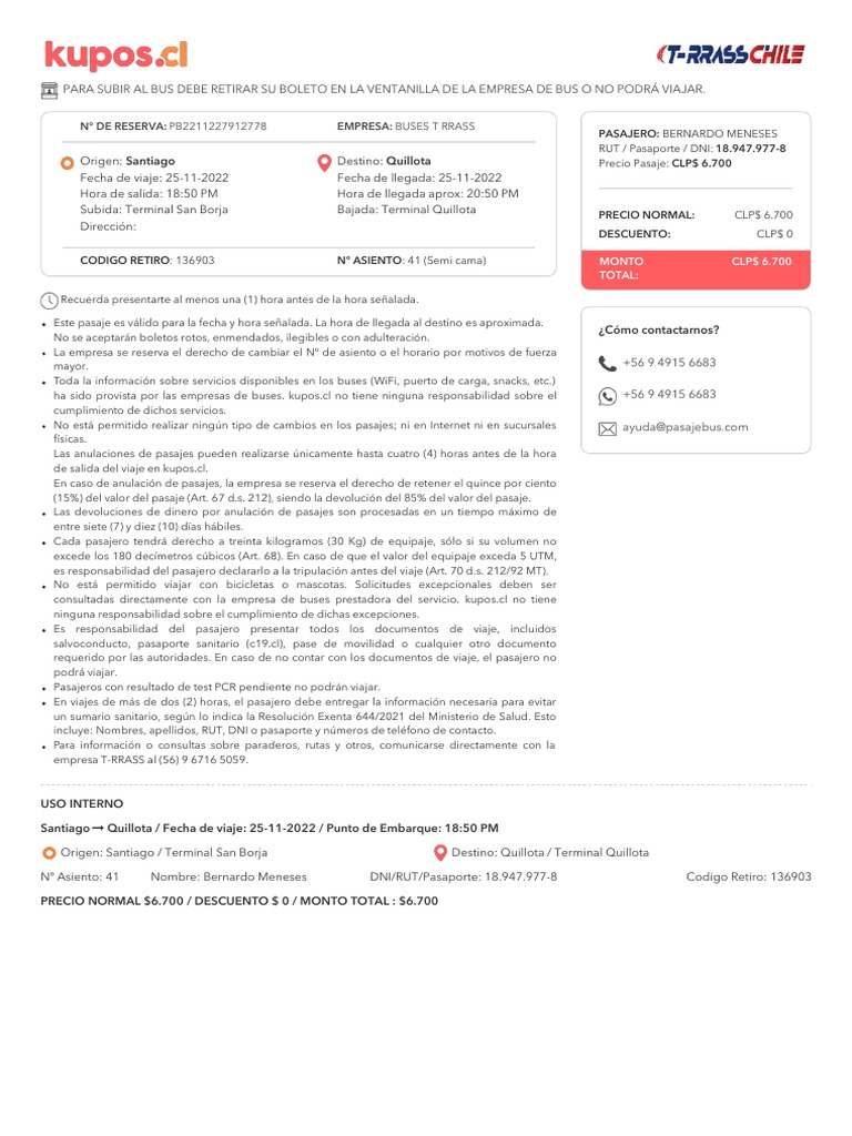 Nº Asiento: 41 Nombre: Bernardo Meneses DNI/RUT/Pasaporte: 18.947.977-8 Codigo Retiro: 136903