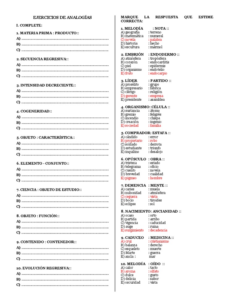EJERCICIOS DE ANALOGÍAS MARQUE LA RESPUESTA QUE ESTIME
