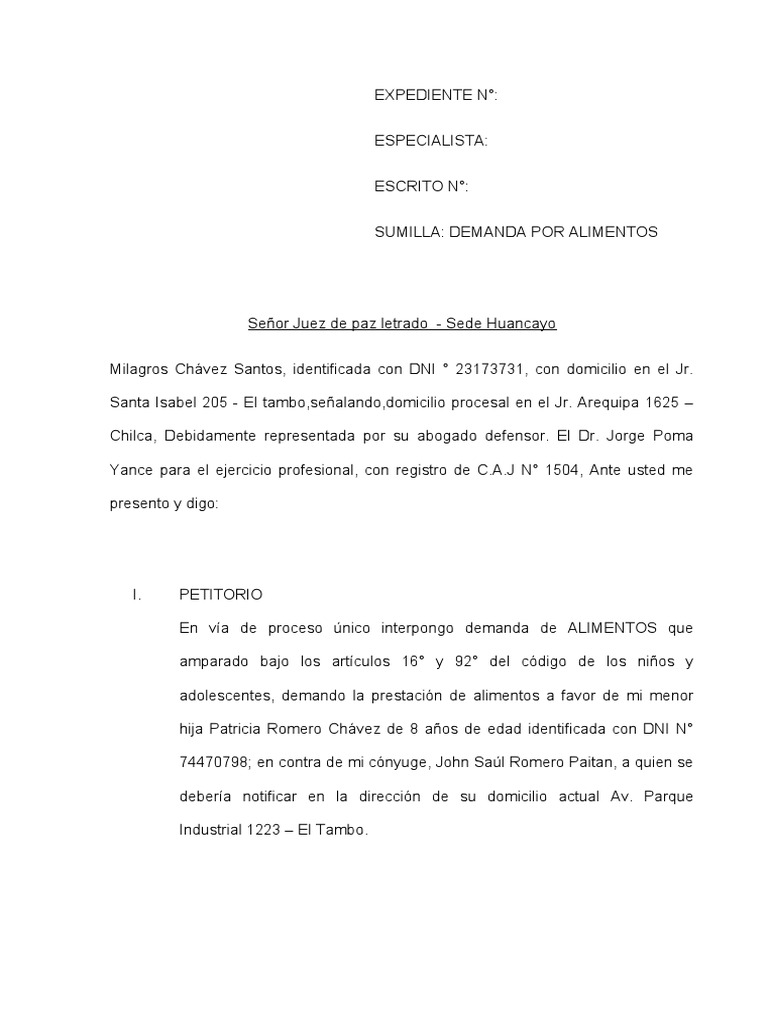 En vía de proceso único interpongo demanda de ALIMENTOS que