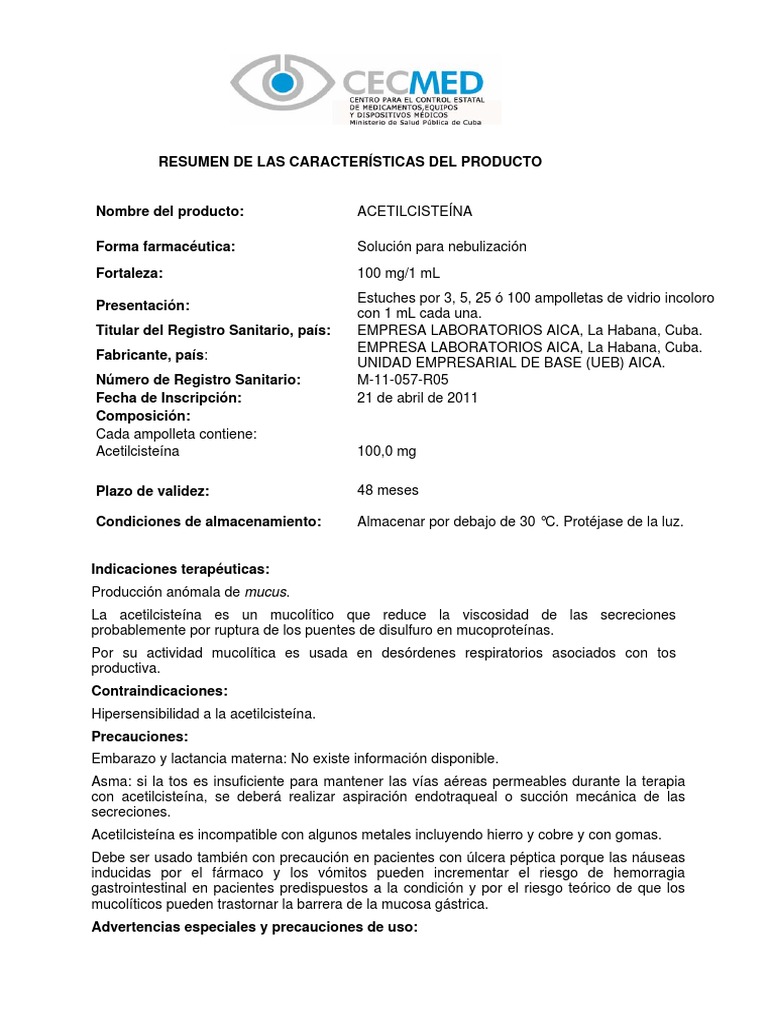 La acetilcisteína disminuye la viscosidad de las secreciones pulmonares y facilita su