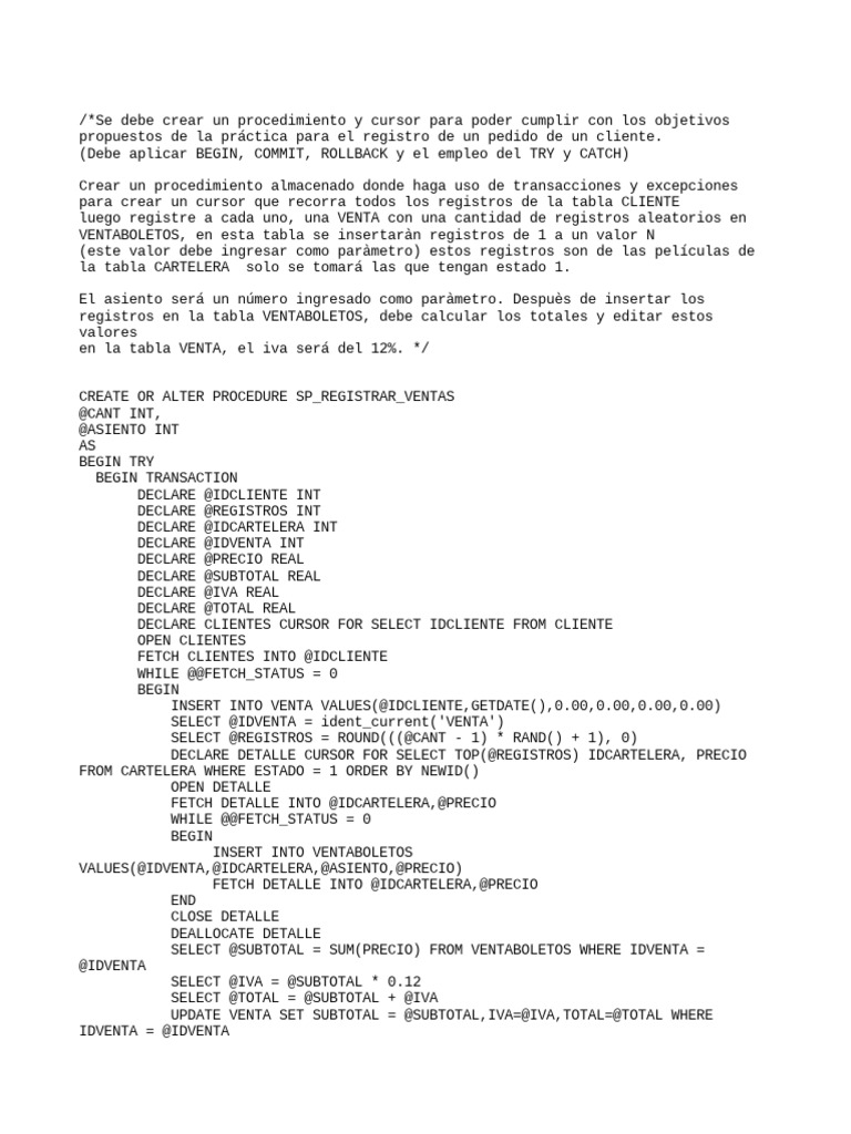 Crear un procedimiento almacenado donde haga uso de transacciones y excepciones