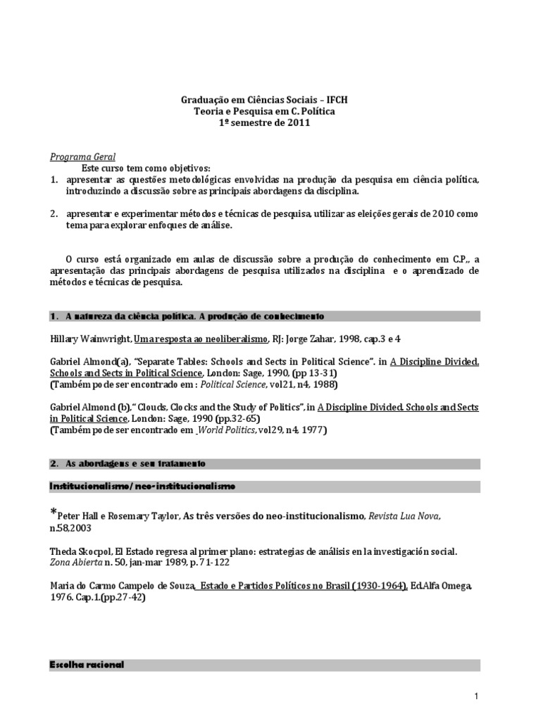 1. A natureza da cincia poltica. A produo de conhecimento Hillary Wainwright, Uma resposta ao neoliberalismo, RJ: Jorge Zahar, 1998, cap.3 e 4 Gabriel Almond(a), Separate Tables: Schools and Sects in Political Science. in A Discipline Divided. Schools and Sects in Political Science, London: Sage, 1990, (pp 13-31) (Tambm pode ser encontrado em : Political Science, vol21, n4, 1988) Gabriel Almond (b), Clouds, Clocks and the Study of Politics, in A Discipline Divided. Schools and Sects in Political Science, London: Sage, 1990 (pp.32-65) (Tambm pode ser encontrado em World Politics, vol29, n4, 1977)