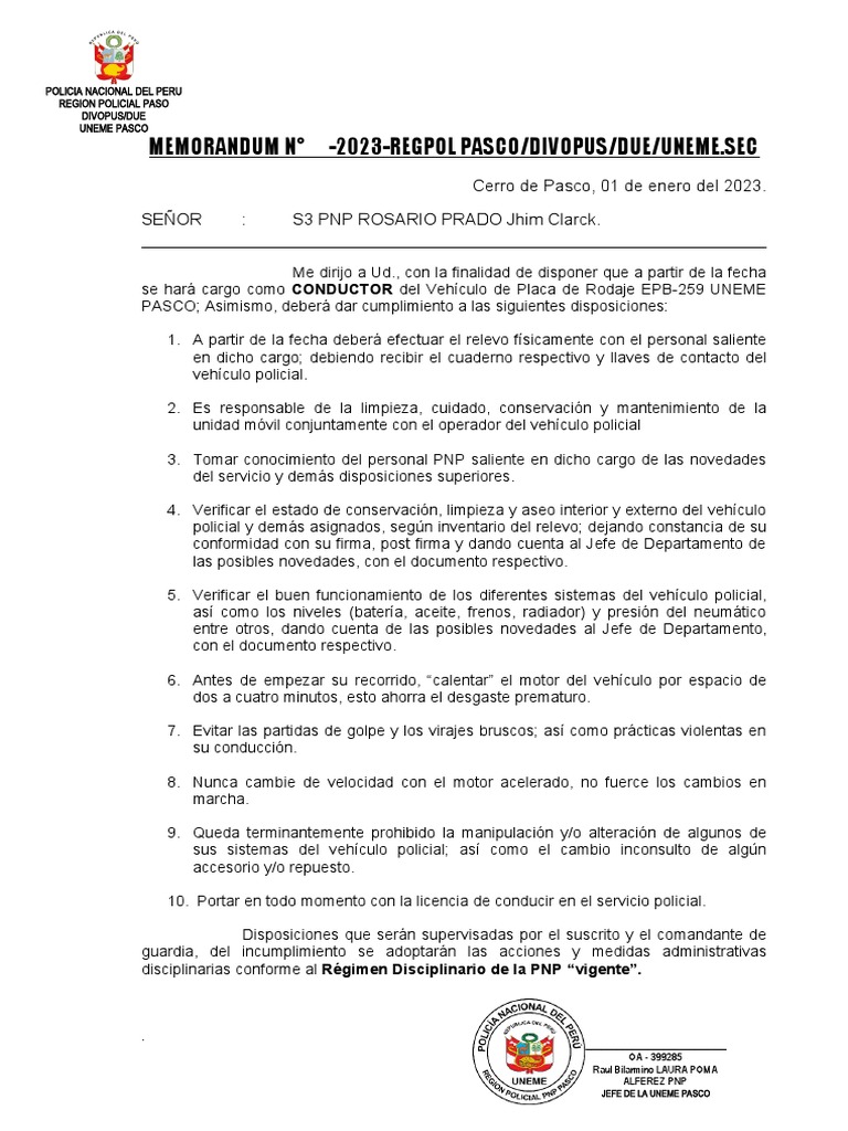 MEMORANDUM N° -2023-REGPOL PASCO/DIVOPUS/DUE/UNEME.SEC