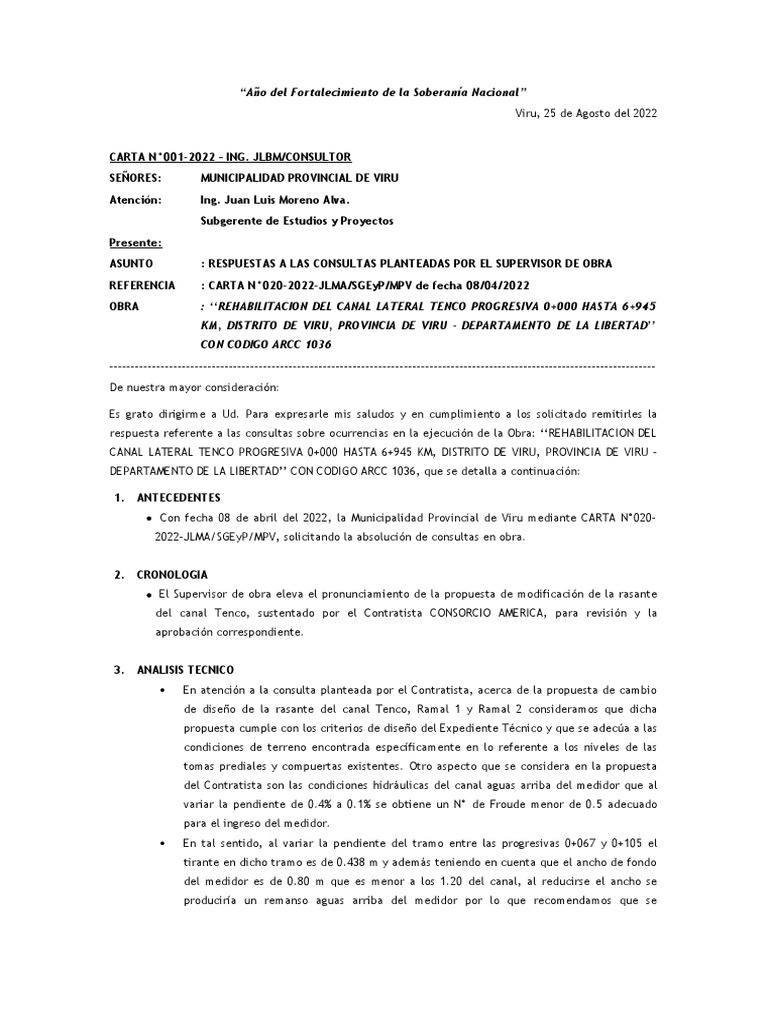 CARTA N°001-2022 – ING. JLBM/CONSULTOR