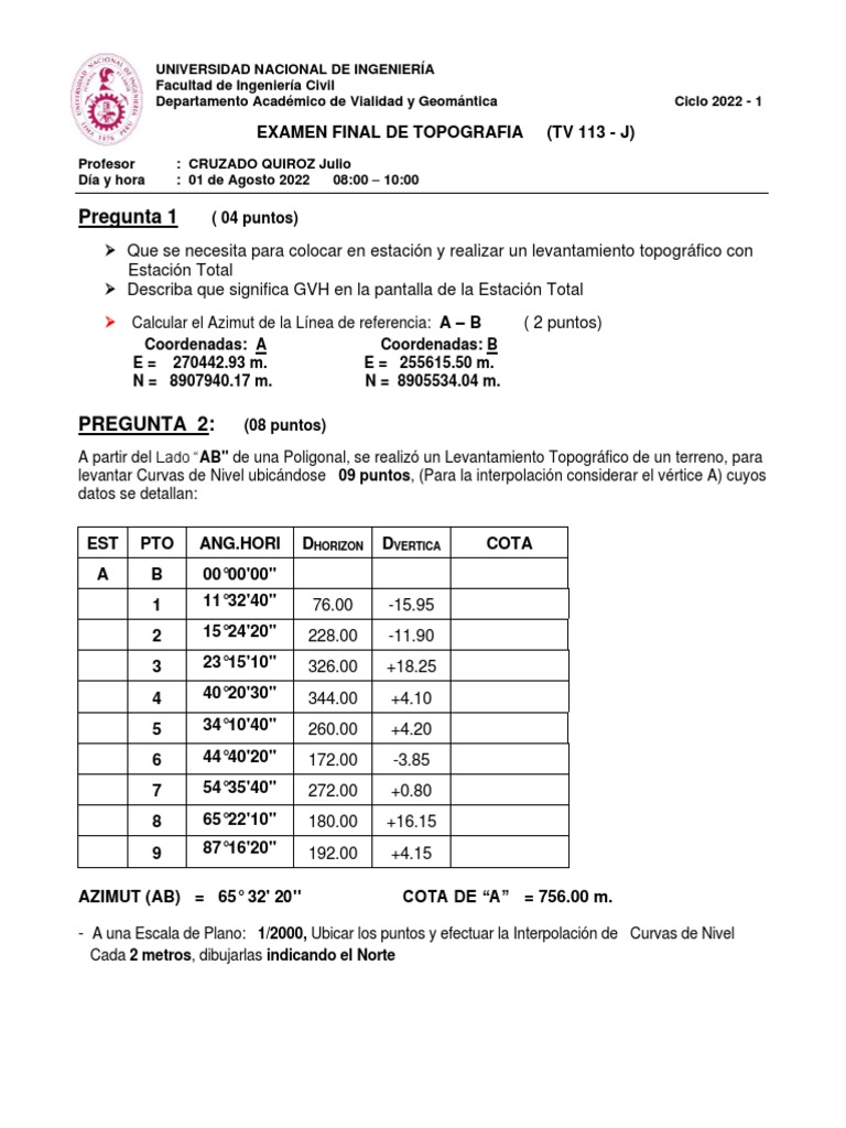 EXAMEN FINAL DE TOPOGRAFIA (TV 113 - J)