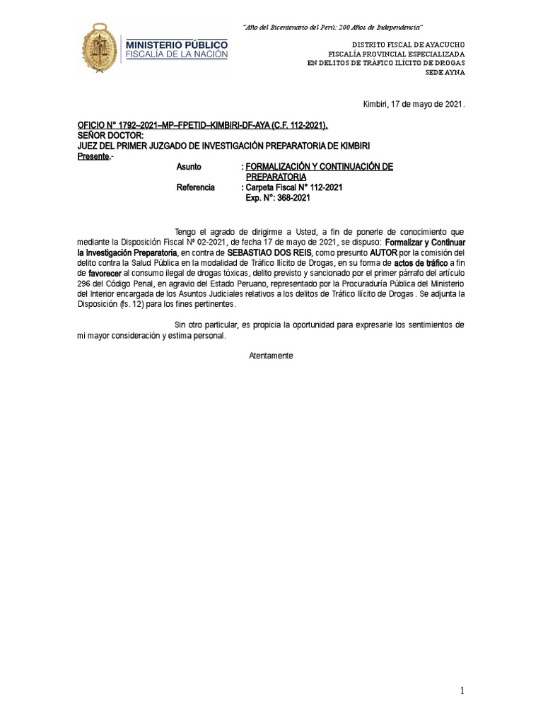 OFICIO N° 1792–2021–MP–FPETID–KIMBIRI-DF-AYA (C.F. 112-2021).