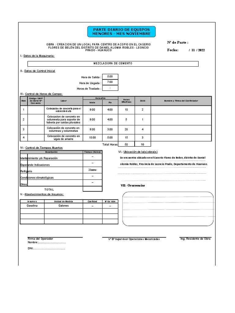Firma del Operador Vº Bº Supervisor Operaciones Mecanizadas Ing. Residente de Obra