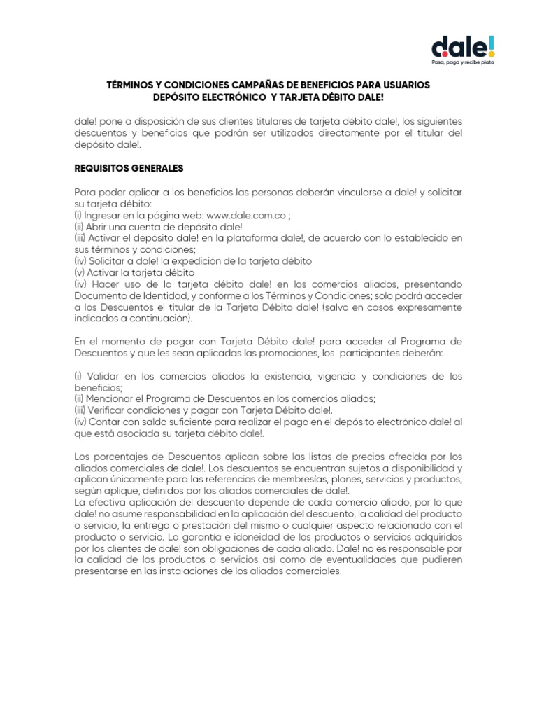 según aplique, definidos por los aliados comerciales de dale!.