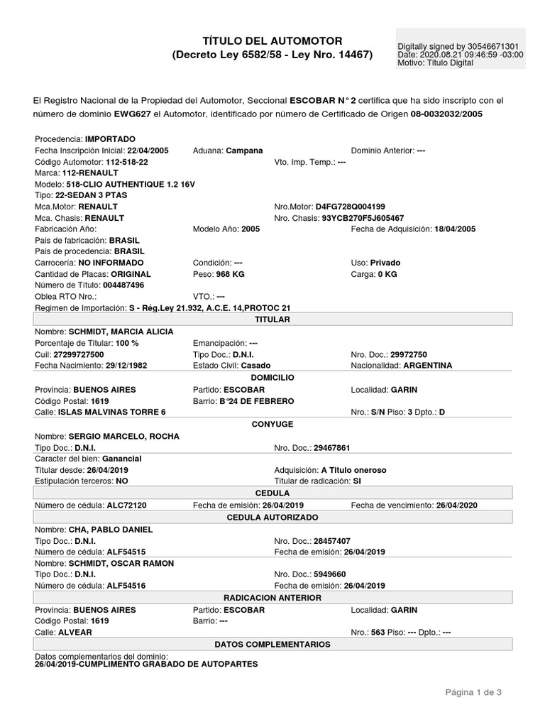 Titular desde: 26/04/2019 Adquisición: A Titulo oneroso