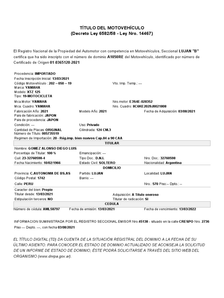Titular desde: 13/03/2021 Adquisición: A Titulo oneroso