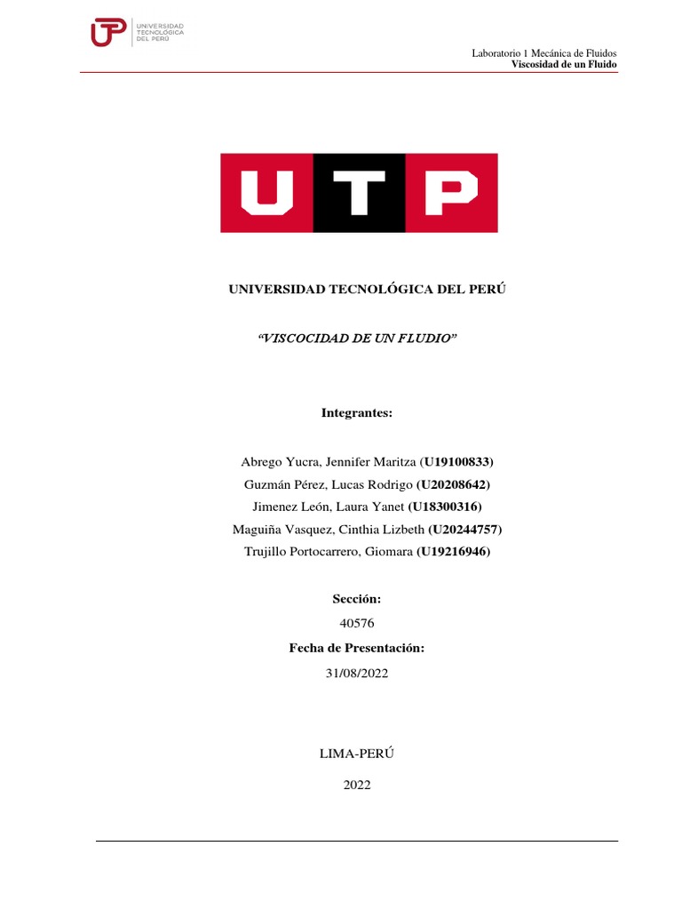 ✓ El objetivo del presente laboratorio es calcular la viscosidad de un fluido; por ejemplo: