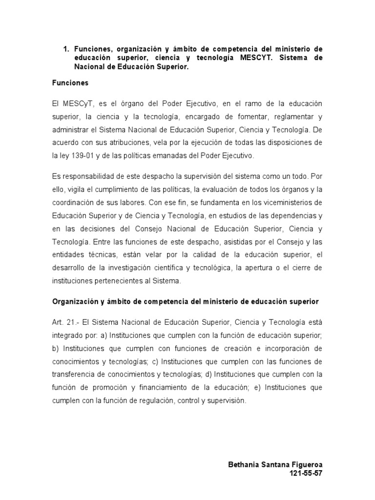 Organización y ámbito de competencia del ministerio de educación superior
