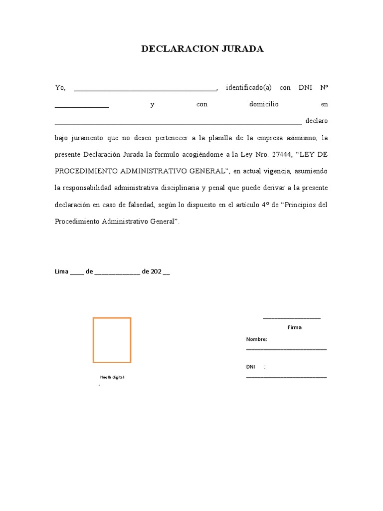 bajo juramento que no deseo pertenecer a la planilla de la empresa asimismo, la