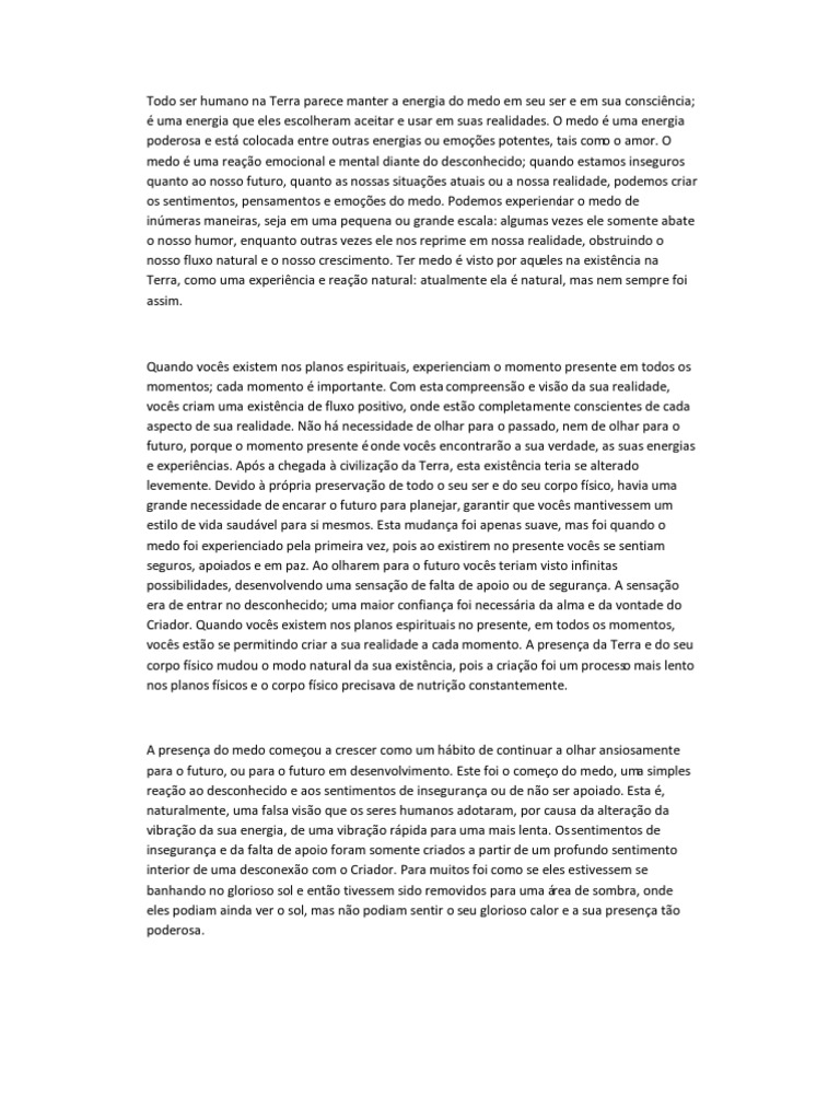 e eles escolheram aceitar e usar em suas realidades. O medo uma energia poderosa e est colocada entre outras energias ou emoes potentes, tais como o amor. O medo uma reao emocional e mental diante do desconhecido; quando estamos inseguros quanto ao nosso futuro, quanto as nossas situaes atuais ou a nossa realidade, podemos criar os sentimentos, pensamentos e emoes do medo. Podemos experienc o medo de iar inmeras maneiras, seja em uma pequena ou grande escala: algumas vezes ele somente abate o nosso humor, enquanto outras vezes ele nos reprime em nossa realidade, obstruindo o nosso fluxo natural e o nosso crescimento. Ter medo visto por aqueles na existncia na Terra, como uma experincia e reao natural: atualmente ela natural, mas nem sempre foi assim.