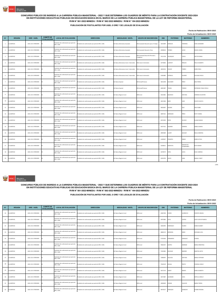 PUBLICACIÓN DE POSTULANTES POR UGEL O DRE Y DE LOCALES DE EVALUACIÓN