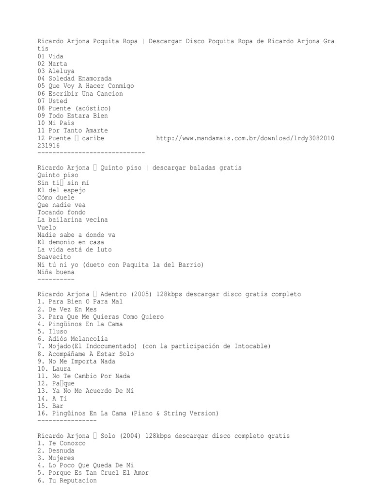 04 Soledad Enamorada 05 Que Voy A Hacer Conmigo 06 Escribir Una Cancion 07 Usted 08 Puente (acstico) 09 Todo Estara Bien 10 Mi Pais 11 Por Tanto Amarte 12 Puente caribe http://www.mandamais.com.br/download/lrdy3082010 231916 ----------------------------Ricardo Arjona Quinto piso descargar baladas gratis Quinto piso Sin ti sin m El del espejo Cmo duele Que nadie vea Tocando fondo La bailarina vecina Vuelo Nadie sabe a donde va El demonio en casa La vida est de luto Suavecito Ni t ni yo (dueto con Paquita la del Barrio) Nia buena ---------Ricardo Arjona Adentro (2005) 128kbps descargar disco gratis completo 1. Para Bien O Para Mal 2. De Vez En Mes 3. Para Que Me Quieras Como Quiero 4. Pinginos En La Cama 5. Iluso 6. Adis Melancola 7. Mojado(El Indocumentado) (con la participacin de Intocable) 8. Acompame A Estar Solo 9. No Me Importa Nada 10. Laura 11. No Te Cambio Por Nada 12. Pa que 13. Ya No Me Acuerdo De M 14. A T 15. Bar 16. Pinginos En La Cama (Piano & String Version) ---------------Ricardo Arjona Solo (2004) 128kbps descargar disco completo gratis 1. Te Conozco 2. Desnuda 3. Mujeres 4. Lo Poco Que Queda De Mi 5. Porque Es Tan Cruel El Amor 6. Tu Reputacion