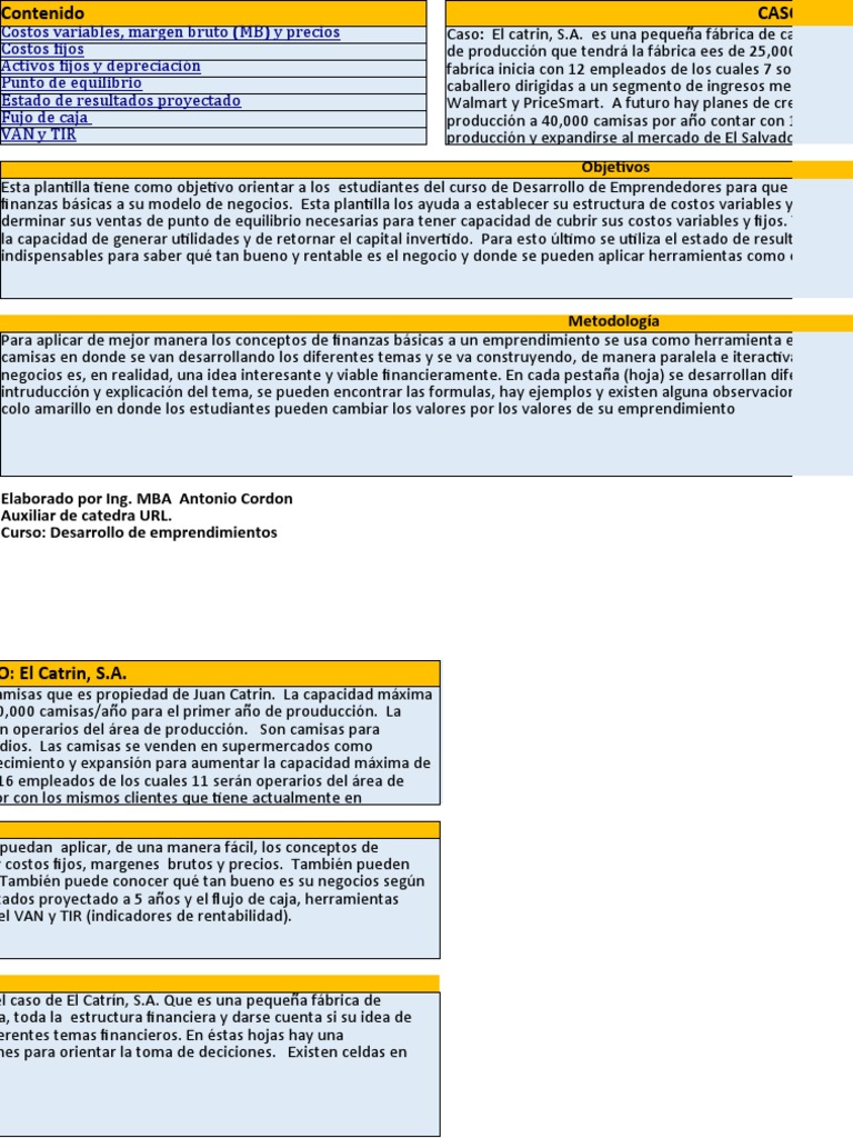 negocios es, en realidad, una idea interesante y viable financieramente. En cada pestaña (hoja) se desarrollan diferentes te