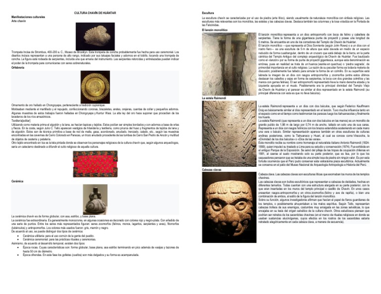 Manifestaciones culturales La escultura chavín se caracterizaba por el uso de piedra (arte lítico), siendo usualmente de naturaleza monolítica con énfasis religioso. Las