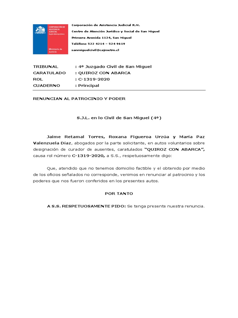 de los oficios señalados no corresponde, venimos en renunciar al patrocinio y los