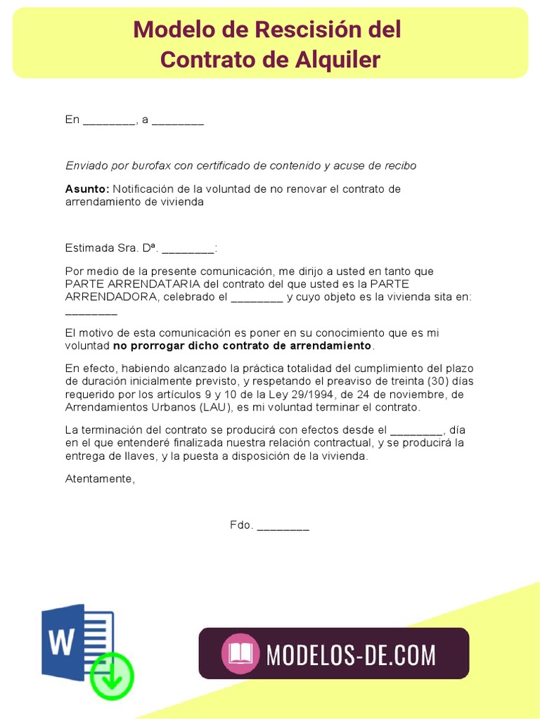 Asunto: Notificación de la voluntad de no renovar el contrato de