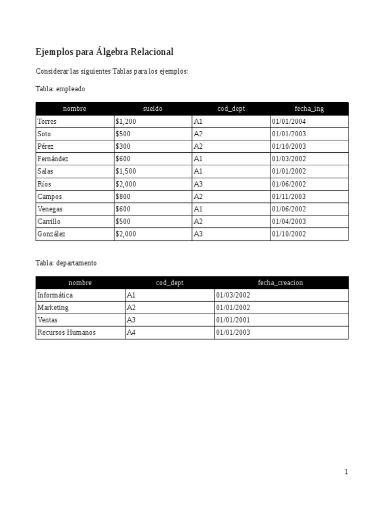 Considerar las siguientes Tablas para los ejemplos: