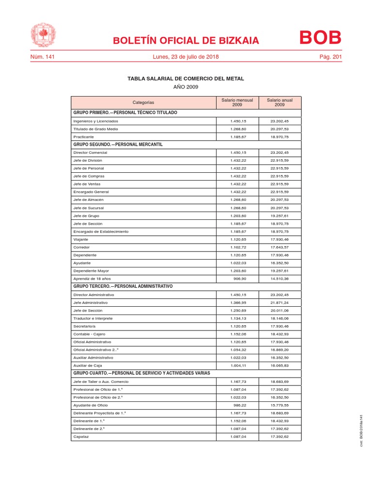 TABLA SALARIAL DE COMERCIO DEL METAL