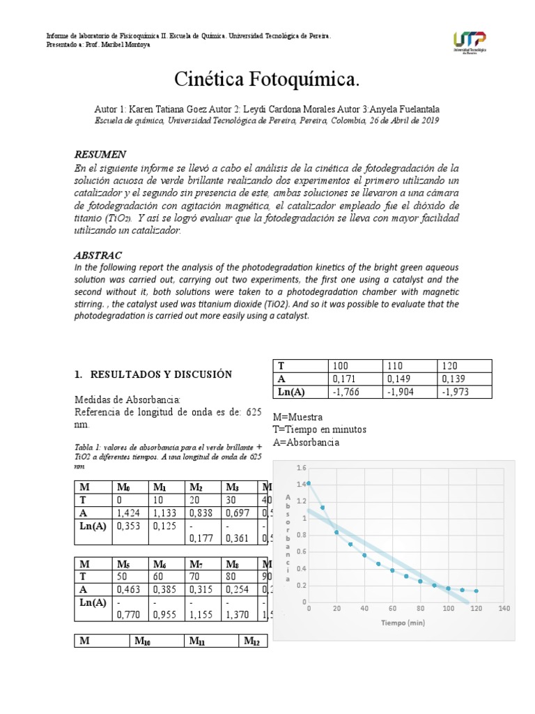 Informe de laboratorio de Fisicoquímica II. Escuela de Química. Universidad Tecnológica de Pereira.