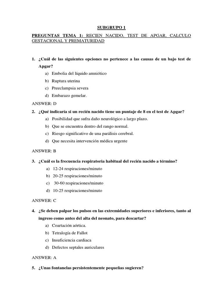 PREGUNTAS TEMA 1: RECIEN NACIDO, TEST DE APGAR, CALCULO