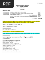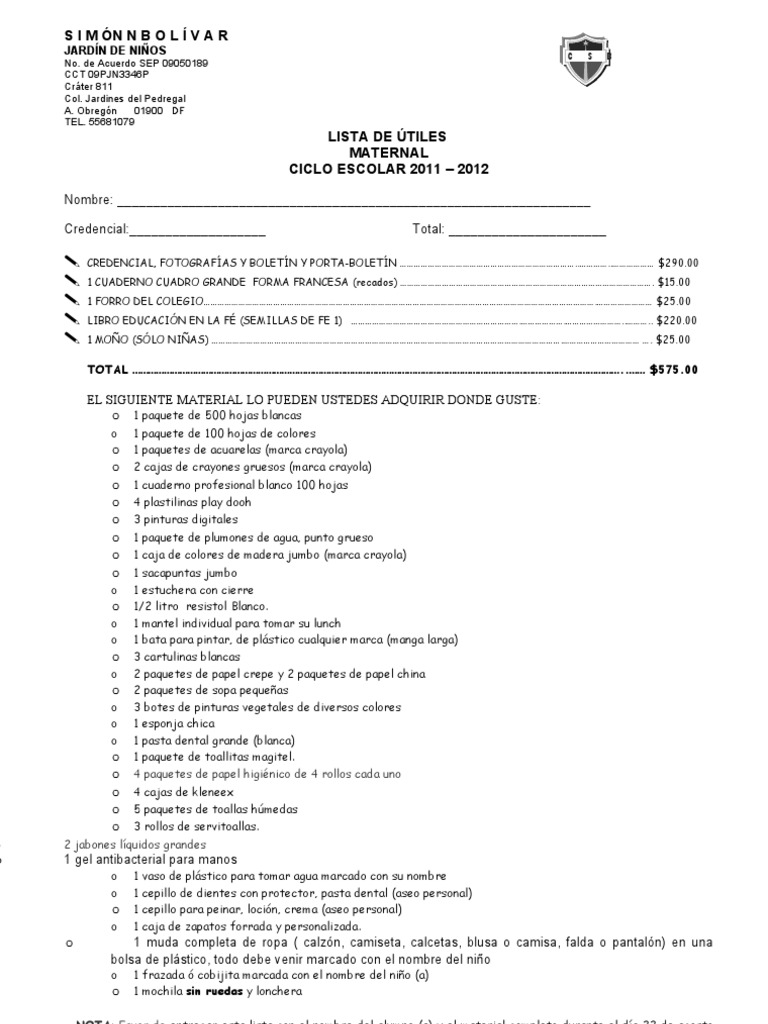 1 paquete de 500 hojas blancas 1 paquete de 100 hojas de colores 1 paquetes de acuarelas (marca crayola) 2 cajas de crayones gruesos (marca crayola) 1 cuaderno profesional blanco 100 hojas 4 plastilinas play dooh 3 pinturas digitales 1 paquete de plumones de agua, punto grueso 1 caja de colores de madera jumbo (marca crayola) 1 sacapuntas jumbo 1 estuchera con cierre 1/2 litro resistol Blanco. 1 mantel individual para tomar su lunch 1 bata para pintar, de plstico cualquier marca (manga larga) 3 cartulinas blancas 2 paquetes de papel crepe y 2 paquetes de papel china 2 paquetes de sopa pequeas 3 botes de pinturas vegetales de diversos colores 1 esponja chica 1 pasta dental grande (blanca) 1 paquete de toallitas magitel. 4 paquetes de papel higinico de 4 rollos cada uno 4 cajas de kleneex 5 paquetes de toallas hmedas