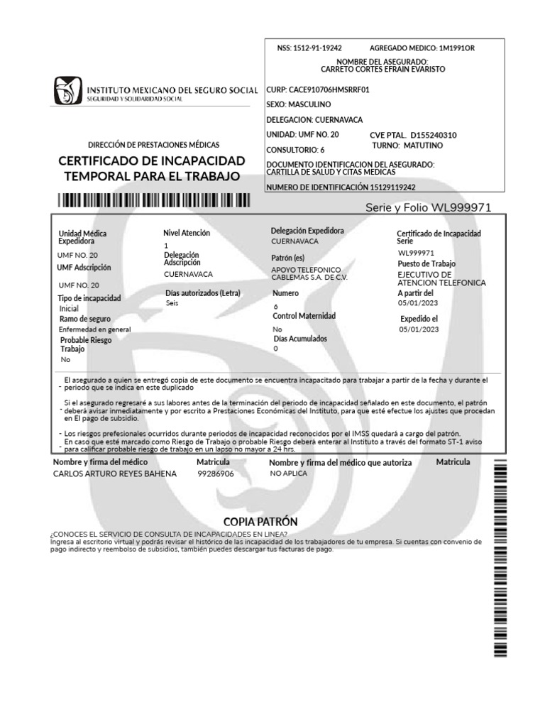 El asegurado a quien se entregó copia de este documento se encuentra incapacitado para trabajar a partir de la fecha y durante el