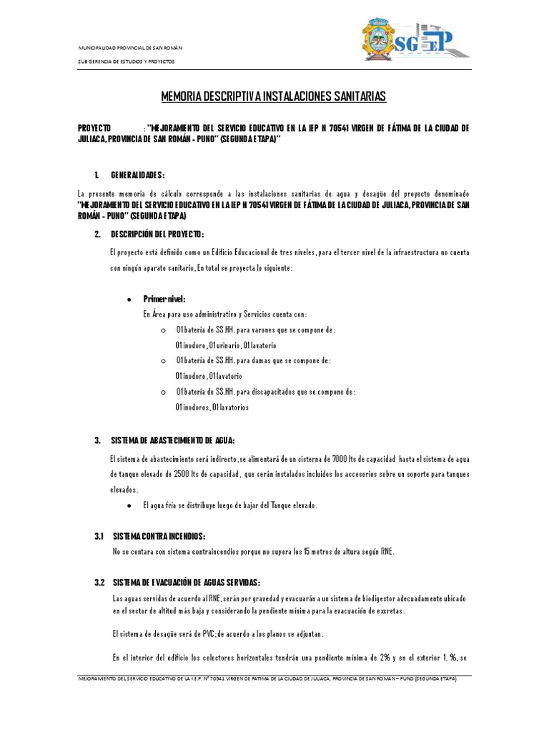 La presente memoria de cálculo corresponde a las instalaciones sanitarias de agua y desagüe del proyecto denominado